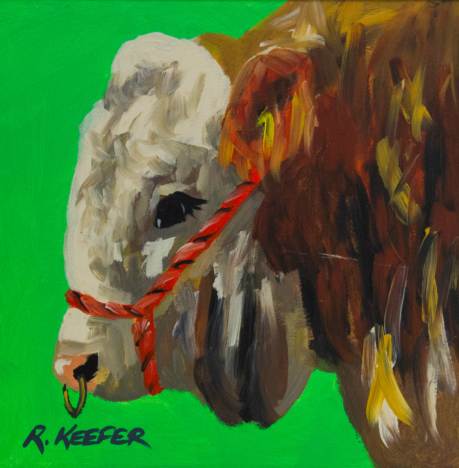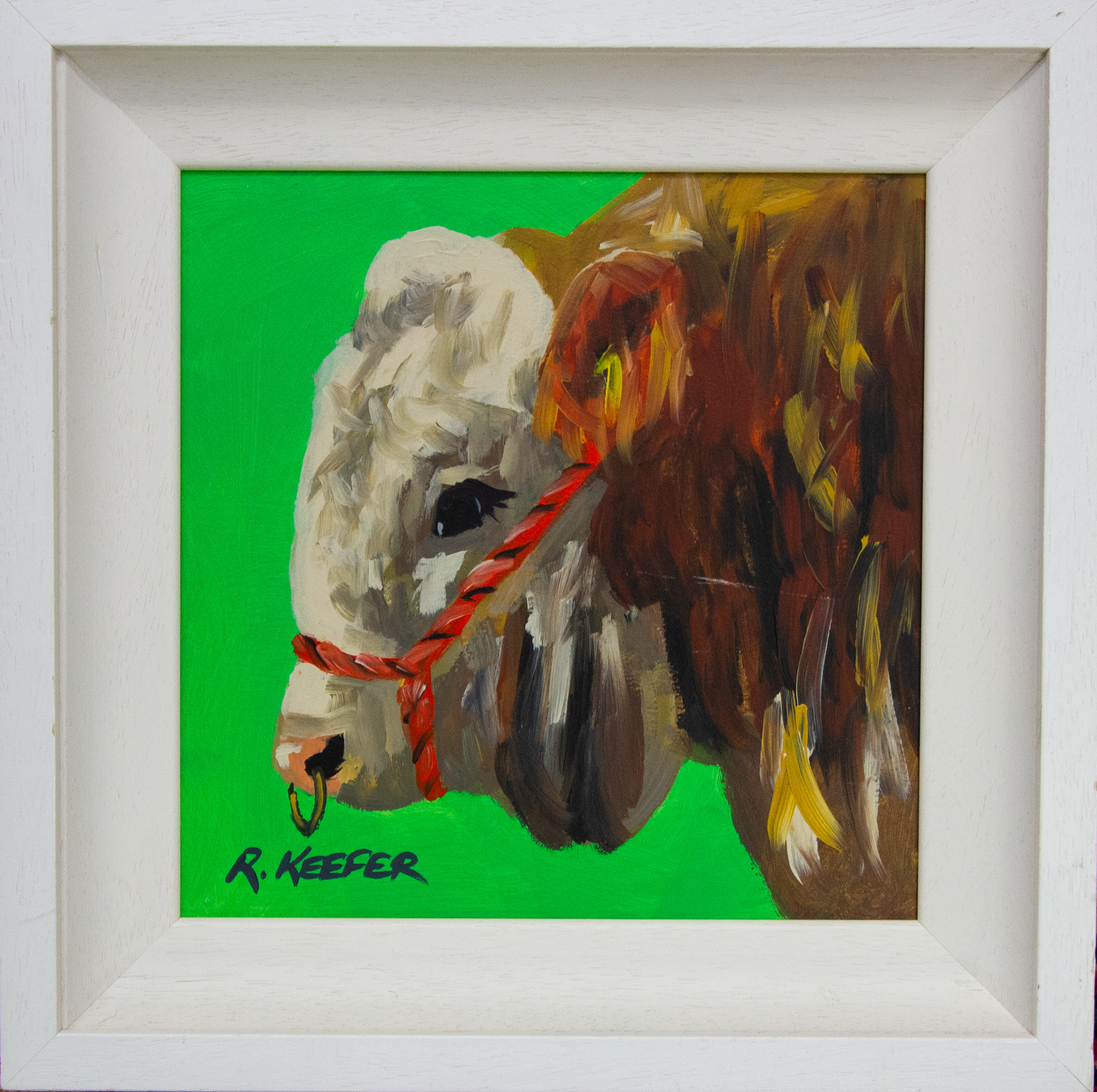 Ronald Keefer oil painting on board “Green Bull”. Frame measures 42w x 42h in cm, painting measures 29w x 29h cm.